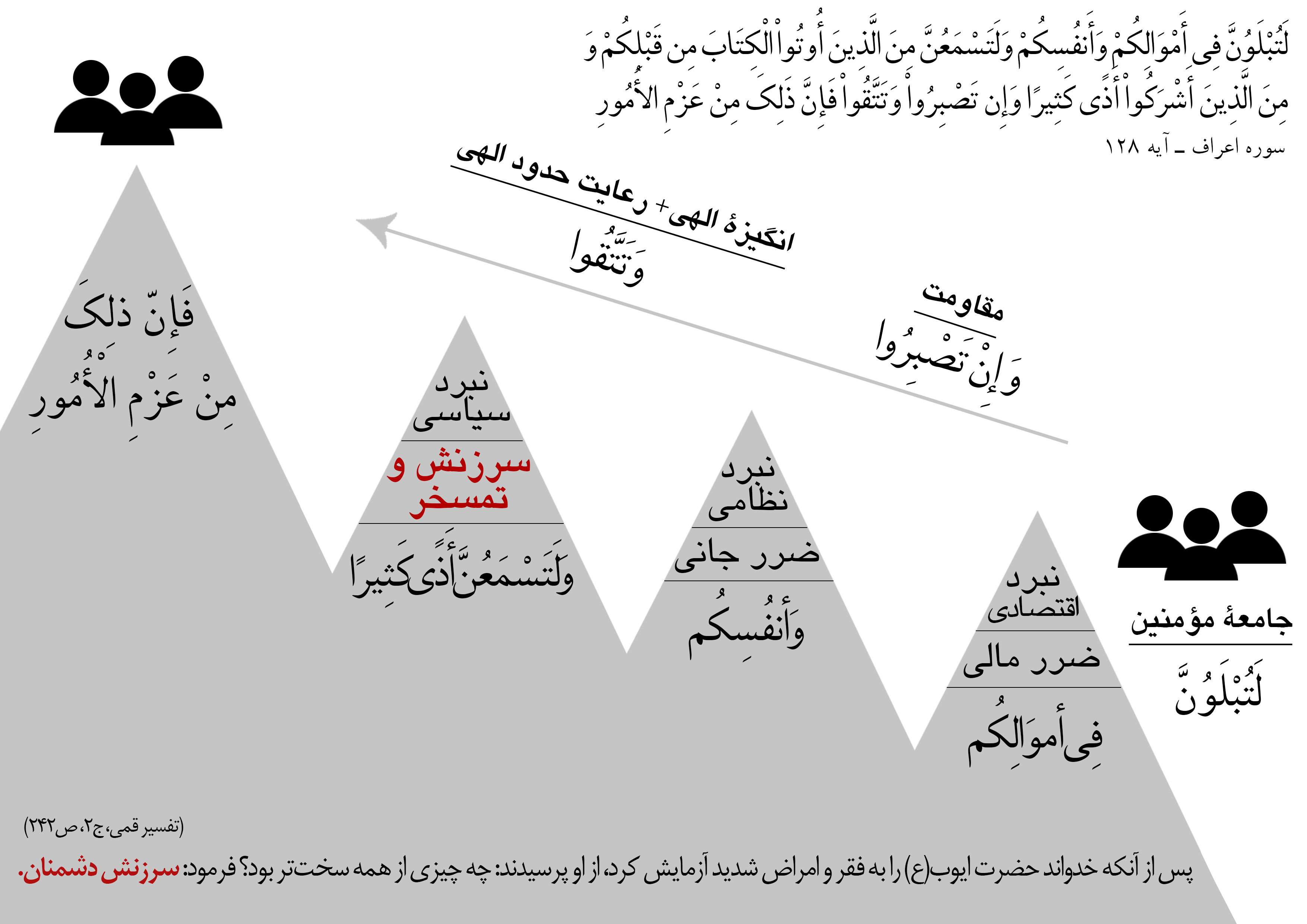 «لَتَسْمَعُنَّ مِنَ الَّذینَ أُوتُوا الْکِتابَ» انگار این سنّت الهی است که یکی از آزمایشهای مؤمنین این است که حرف بشنوند و محکم بایستند. آنهایی که حرف شنیدند و محکم ایستادند حماسهگر میشوند. بعد میفرماید راه حل عبور از این سه نوع مشکل چیست؟ ابتلاء جان، ابتلاء مال، - به تعبیر بنده در زمینههای نظامی و اقتصادی. و در عرصۀ جنگ روانی که علیهمان راه میاندازند، چهکار باید بکنیم؟ «وَ إِنْ تَصْبِرُوا وَ تَتَّقُوا فَإِنَّ ذلِکَ مِنْ عَزْمِ الْأُمُورِ» باید مقاومت کنید.
