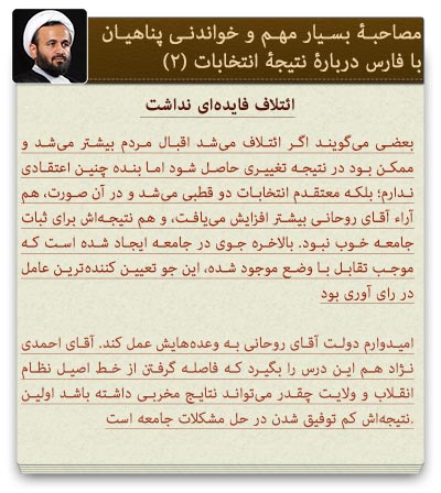 ج: طبیعتا از اینکه با بیانصافی کردن در مناظرهها کسی رای بیاورد راضی نیستم و طبیعتا دوست داشتم یک فرد انقلابیتر رای بیاورد. ولی از بسیاری از نتایج و برکات انتخابات راضی هستم. غیر از فوایدی که قبلا گفتم، یک فایدۀ مهم دیگر این بود که در این انتخابات دیگر حرفی از تفکر اصلاح طلبی به معنای حاکمیت دوگانه و تفکرات ضد خط امام وجود نداشت. حتی آقای عارف هم چنین حرفهایی نزد؛ این خیلی جای خوشحالی دارد. این یعنی دوران آن حرفها و اندیشهها به سر آمده است. اگرچه اصلاح طلبها پشت سر آقای روحانی آمدند اما خودشان هم میدانند که ایشان در خط فکری آنها نیست. شاید خود اصلاح طلبها هم دیگر به آن حرفها و سکولاریزه کردن جامعه معتقد نباشند.