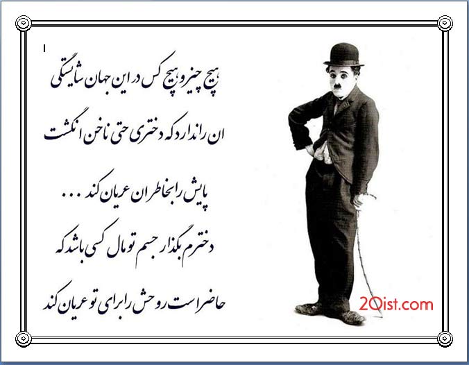 داستان آن دلقک گرسنه که در پست ترین صحنه های لندن آواز می خواند و صدقه می گیرد, داستان من است.من طعم گرسنگی را چشیده ام.من درد نابسامانی را کشیده ام.و از اینها بالاتر رنج حقارت آن دلقک دوره گرد را که اقیانوسی از غرور در دلش موج می زند و سکه صدقه آن رهگذر غرورش را خرد نمی کند. با این همه زنده ام و از زندگان پیش از آنکه بمیرند حرفی نباید زد. به دنبال نام تو نام من است :"چاپلین"
