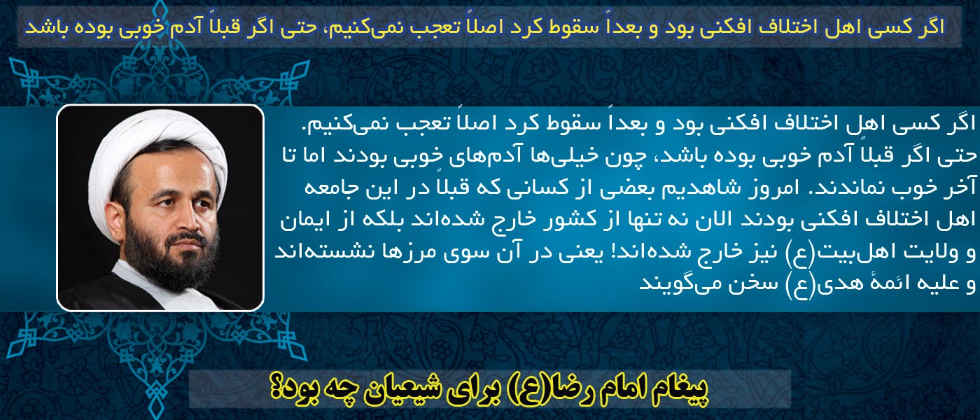 حجت الاسلام علیرضا پناهیان، سپس به مشکلات برخورد با این دو گروه پرداخت و نمونههایی از تاریخ صدر اسلام و برخورد امیرالمؤمنین(ع) را بیان کرد: «جالب این است که شما اگر بخواهید علیه هر کدام از این دو گروهِ باطل سخنی بگویید شما را به «آنطرفی بودن» و وابستگی به گروه باطل مقابل متهم میکنند و میگویند: «تو داری به نفع فلانی این سخن را میگویی.» اگر شما علیه هر کدام از دو جبهۀ باطل که با هم اختلاف دارند بخواهید کاری بکنید، طبعاً به نفع دیگری کار کردهاید و این اجتناب ناپذیر است. لذا این شکنندهترین نوع اختلاف است. در تاریخ اسلام هم نمونۀ این اختلاف شکننده و مهلک وجود داشته است. هم طلحه و زبیر و هم خوارج دشمن معاویه بودند، لذا طبیعتاً جنگ امیرالمؤمنین(ع) با این دو، به نفع معاویه تمام شد. وقتی امیرالمؤمنین شرّ اینها را از سر جامعة اسلامی کم کرد، ضمناً شرّشان را از سر معاویه هم کم کرد.»